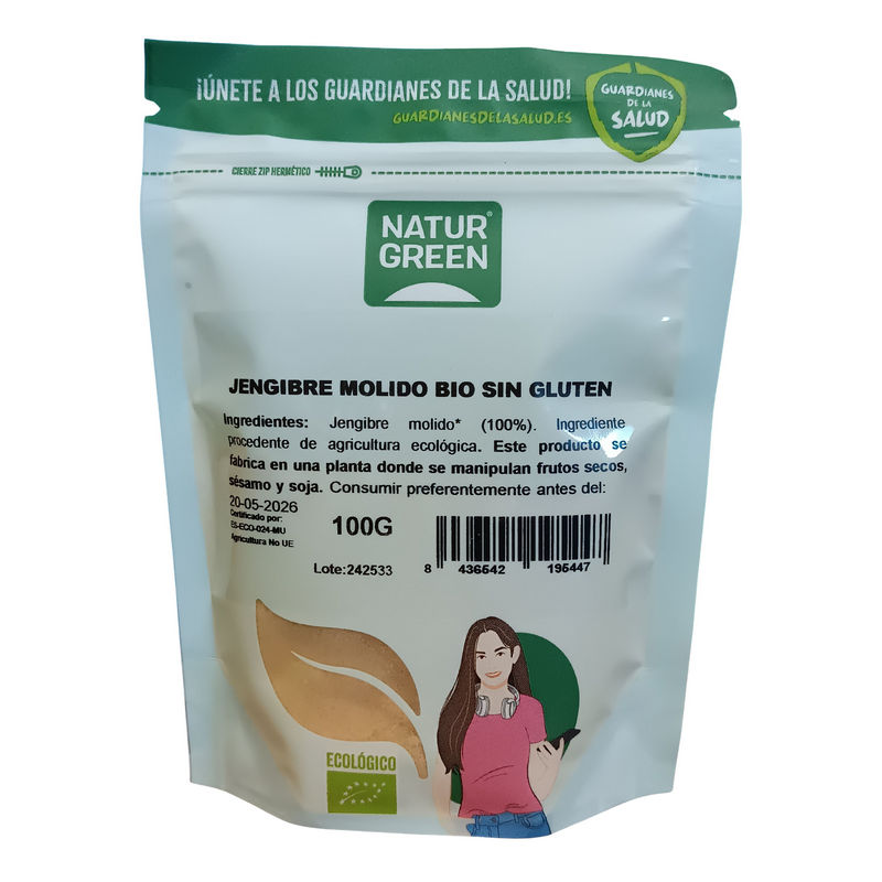Ingredientes: Jengibre molido* (100%). Ingrediente procedente de agricultura ecológica. Este producto se fabrica en una planta donde se manipulan frutos secos, sésamo y soja.